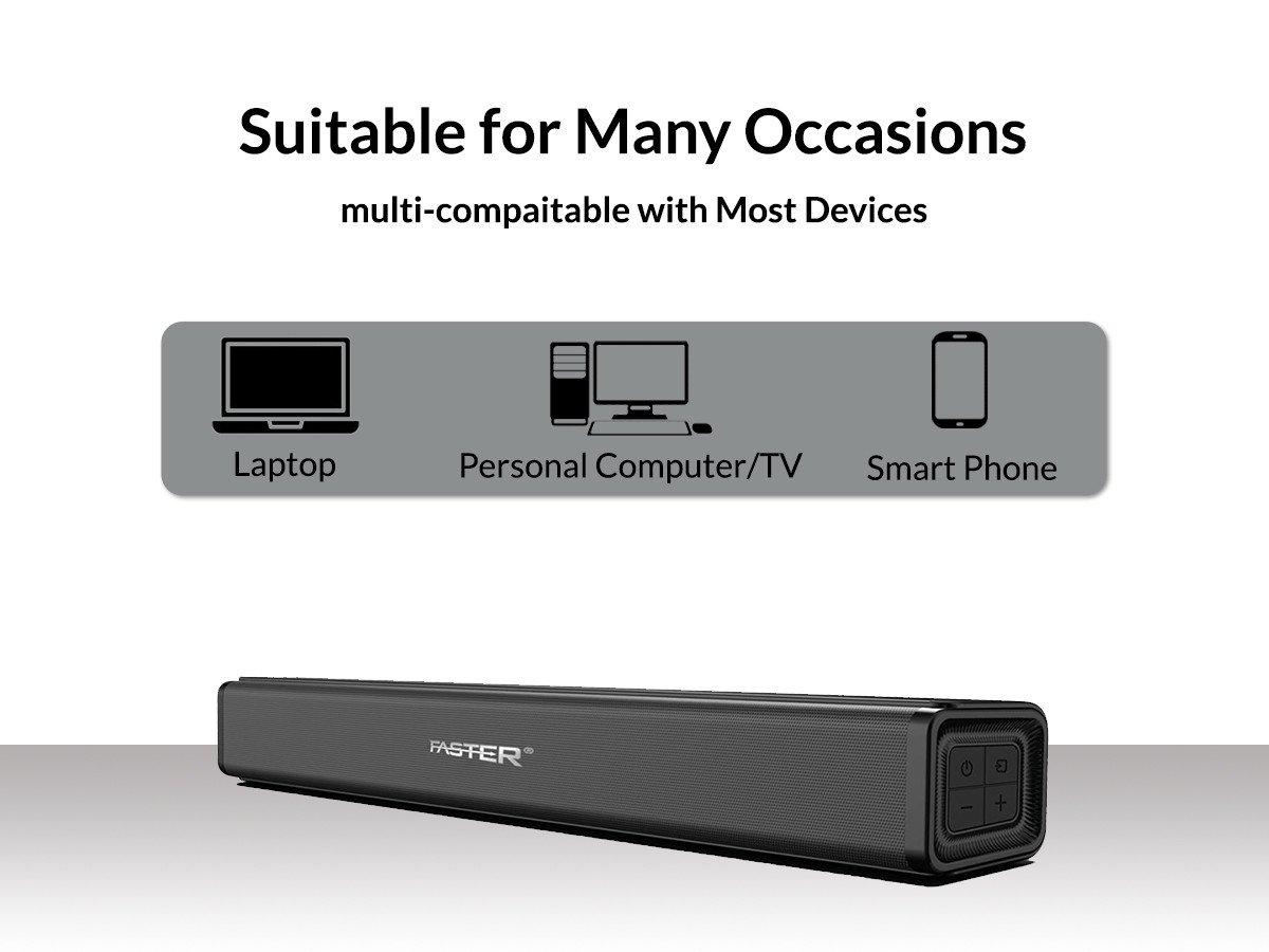 The soundbar's Bluetooth version 5.0 offers a stable wireless range of up to 10 meters, allowing you to stream music from your devices with ease. Say goodbye to messy wires and enjoy seamless wireless connectivity.